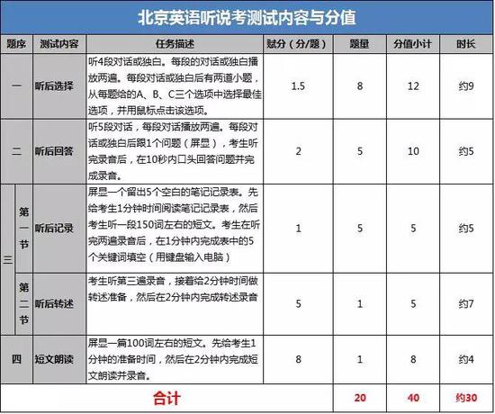 中考英语听说考试分值40分,考试时长为30分钟,每个考生都可以由两次考试机会,第一次考试满分的同学自动视为不参加第二次考试。
